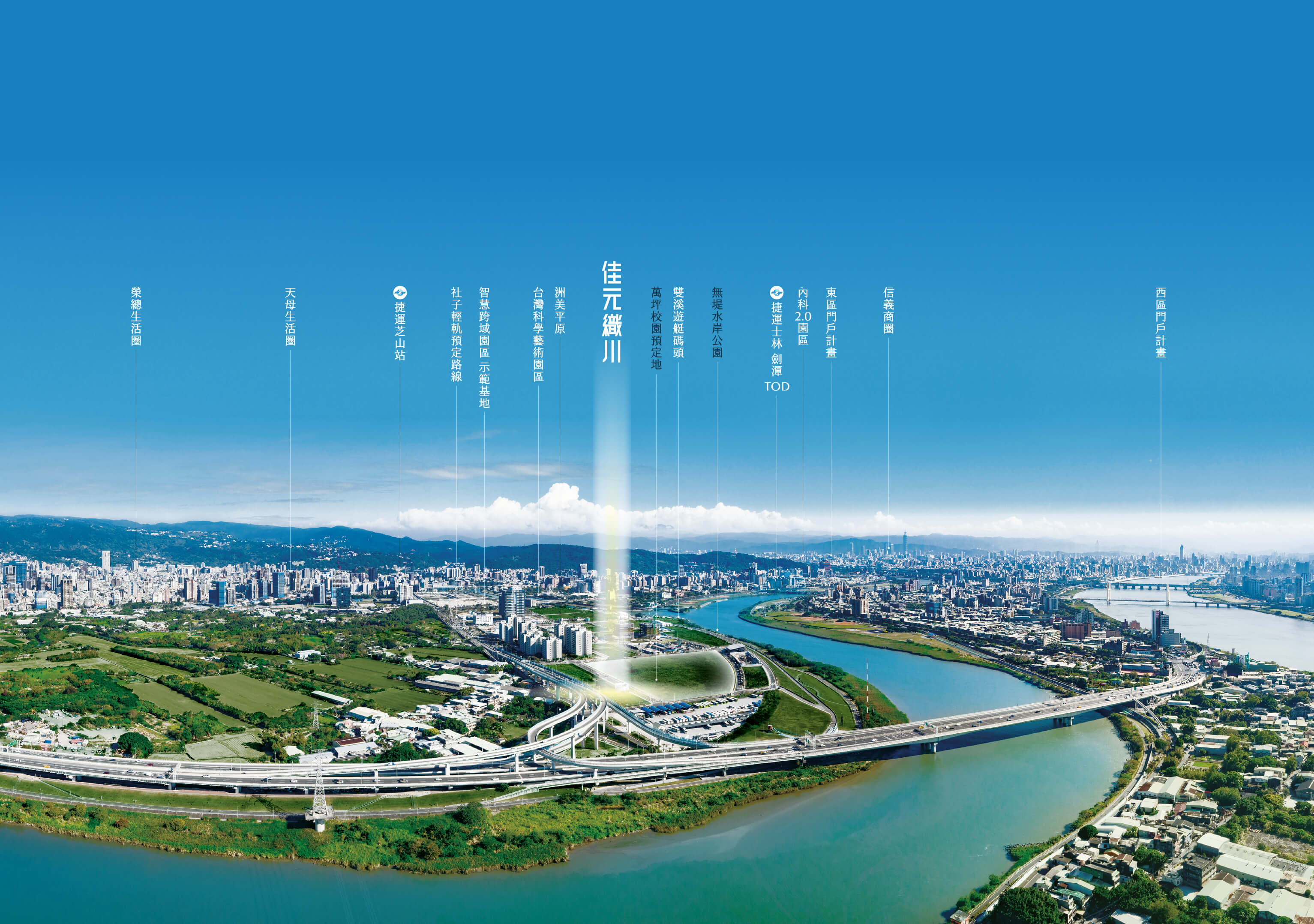 融合科技、生醫、親水商辦及無堤水岸,超越以商業為發展主軸的大直與信義計畫區,串聯東、西區門户計畫,啟動兆元產值,重塑城市天際線,全速開啟國際濱水城區的生活新價值。